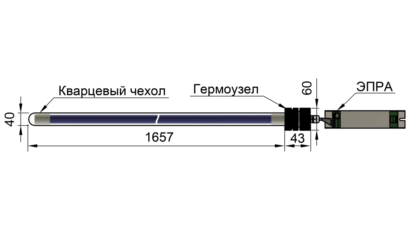 Состав: амальгамная лампа, кварцевый чехол 40×2×1700 мм, фторопластовый узел герметизации, кабель питания 10 м, запасная лампа;