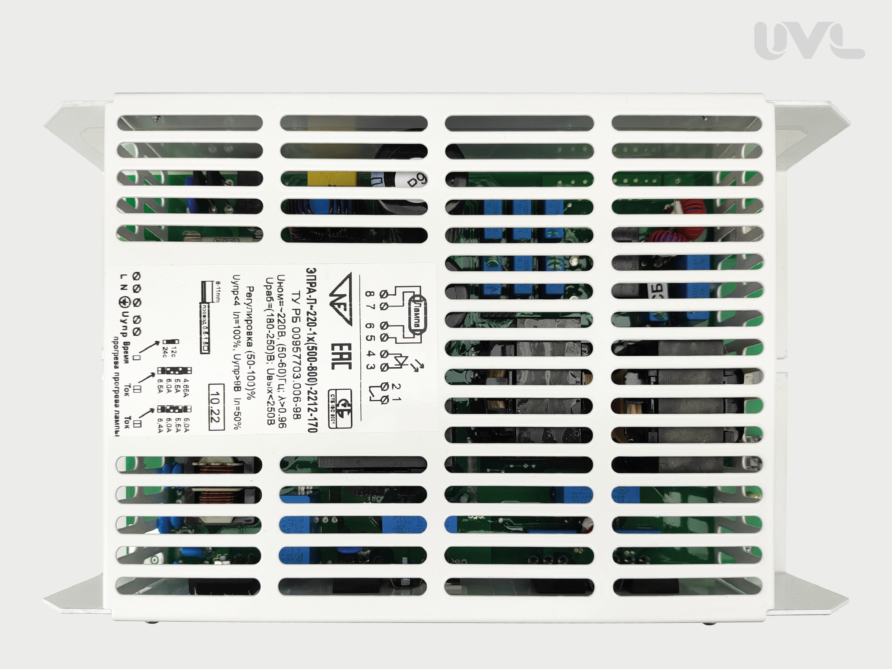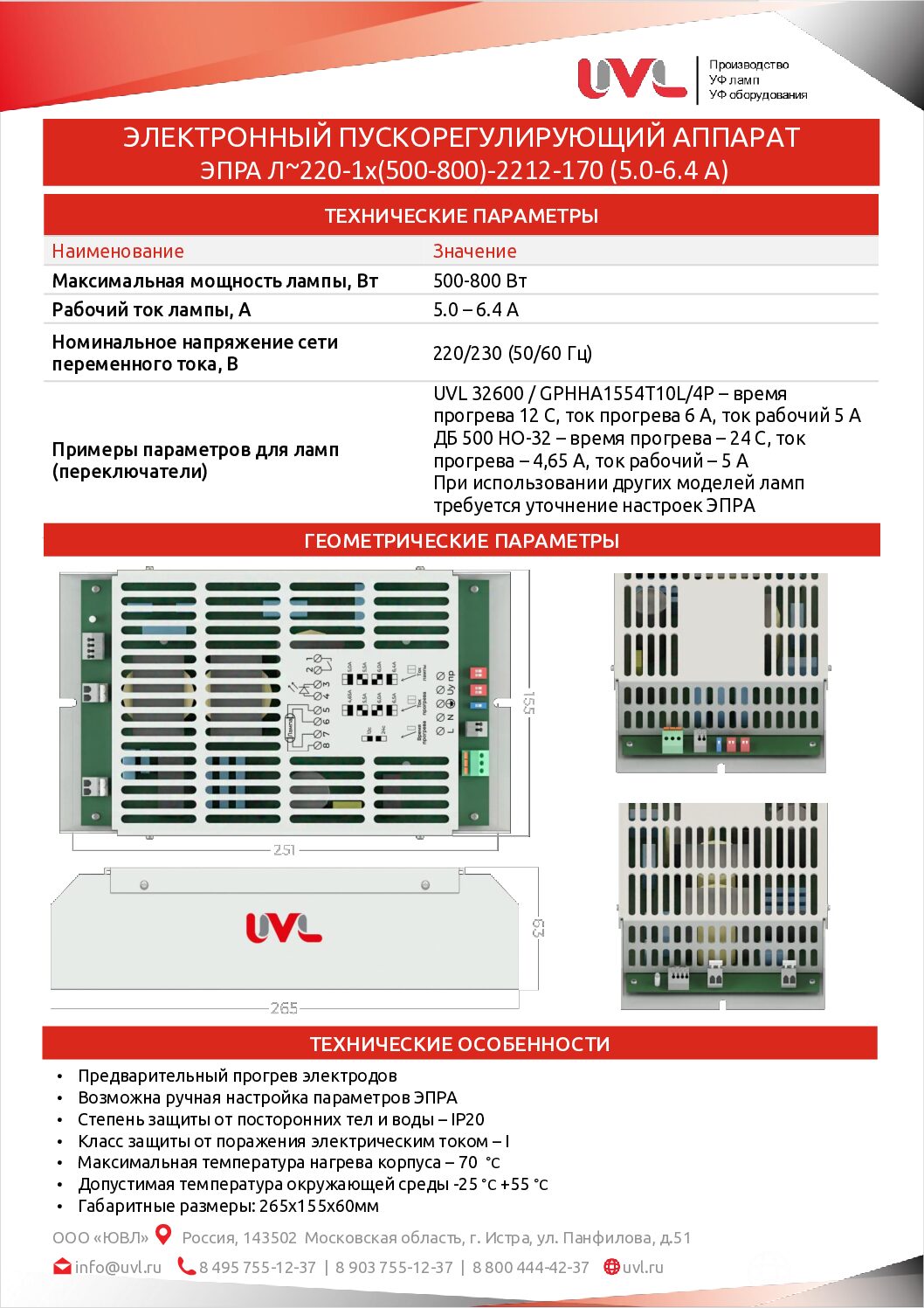 Электронный пускорегулирующий аппарат ЭПРА Л-220-1х(500-800)-2212-170(5.0-6.4А) предназначен для питания УФ ламп с силой рабочего тока 5.0-6.4 А , максимальной мощностью 800 Вт и многих других моделей с соответствующими параметрами.