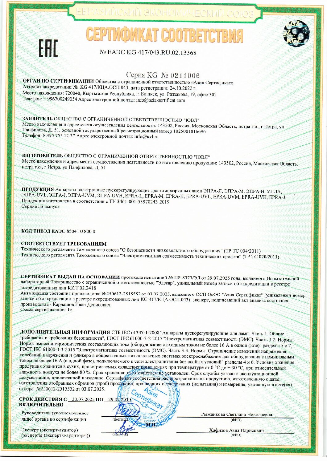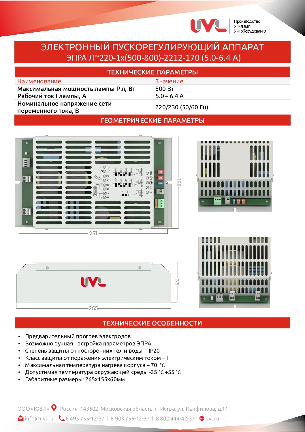 Электронный пускорегулирующий аппарат ЭПРА Л-220-1х(500-800)-2212-170(5.0-6.4А) предназначен для питания УФ ламп с силой рабочего тока 5.0-6.4 А , максимальной мощностью 800 Вт и многих других моделей с соответствующими параметрами.