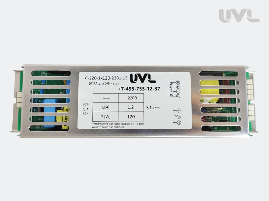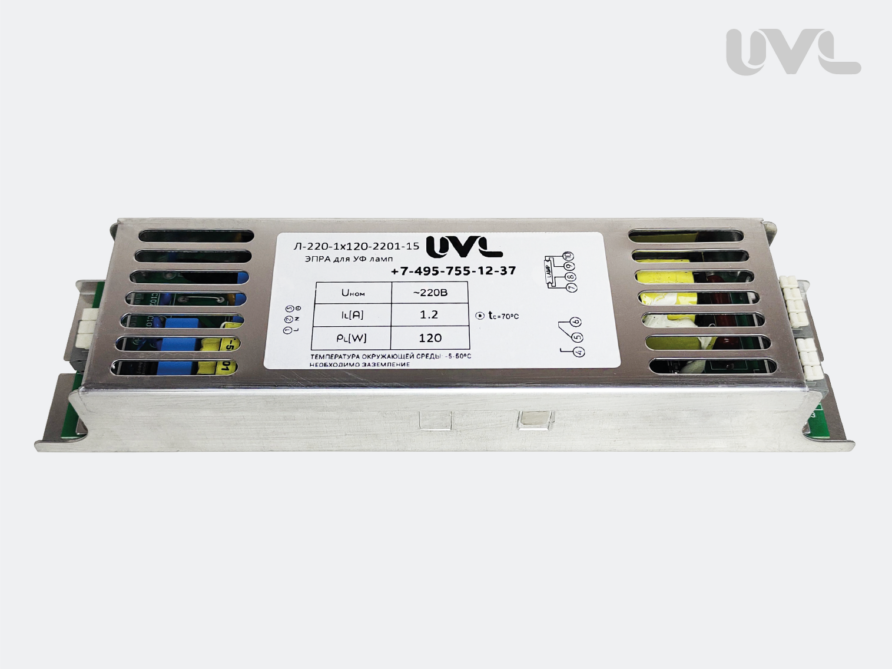Электронный пускорегулирующий аппарат ЭПРА Л-220-1х120-2201-15 предназначен для питания УФ ламп с силой рабочего тока 1,2 А , максимальной мощностью 120 Вт и многих других моделей с соответствующими параметрами.