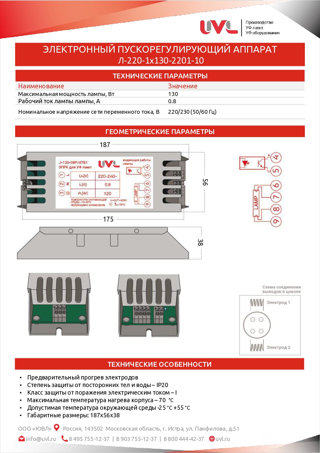 Электронный пускорегулирующий аппарат ЭПРА Л-220-1х130-2201-10 предназначен для питания УФ ламп с силой рабочего тока 0,8 А , максимальной мощностью 130 Вт и многих других моделей с соответствующими параметрами.