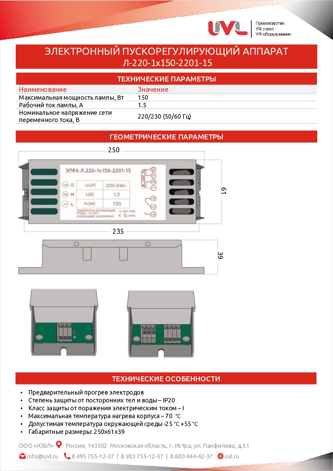 Электронный пускорегулирующий аппарат ЭПРА Л-220-1х150-2201-15 предназначен для питания УФ ламп с силой рабочего тока 1,5 А , максимальной мощностью 150 Вт и многих других моделей с соответствующими параметрами.