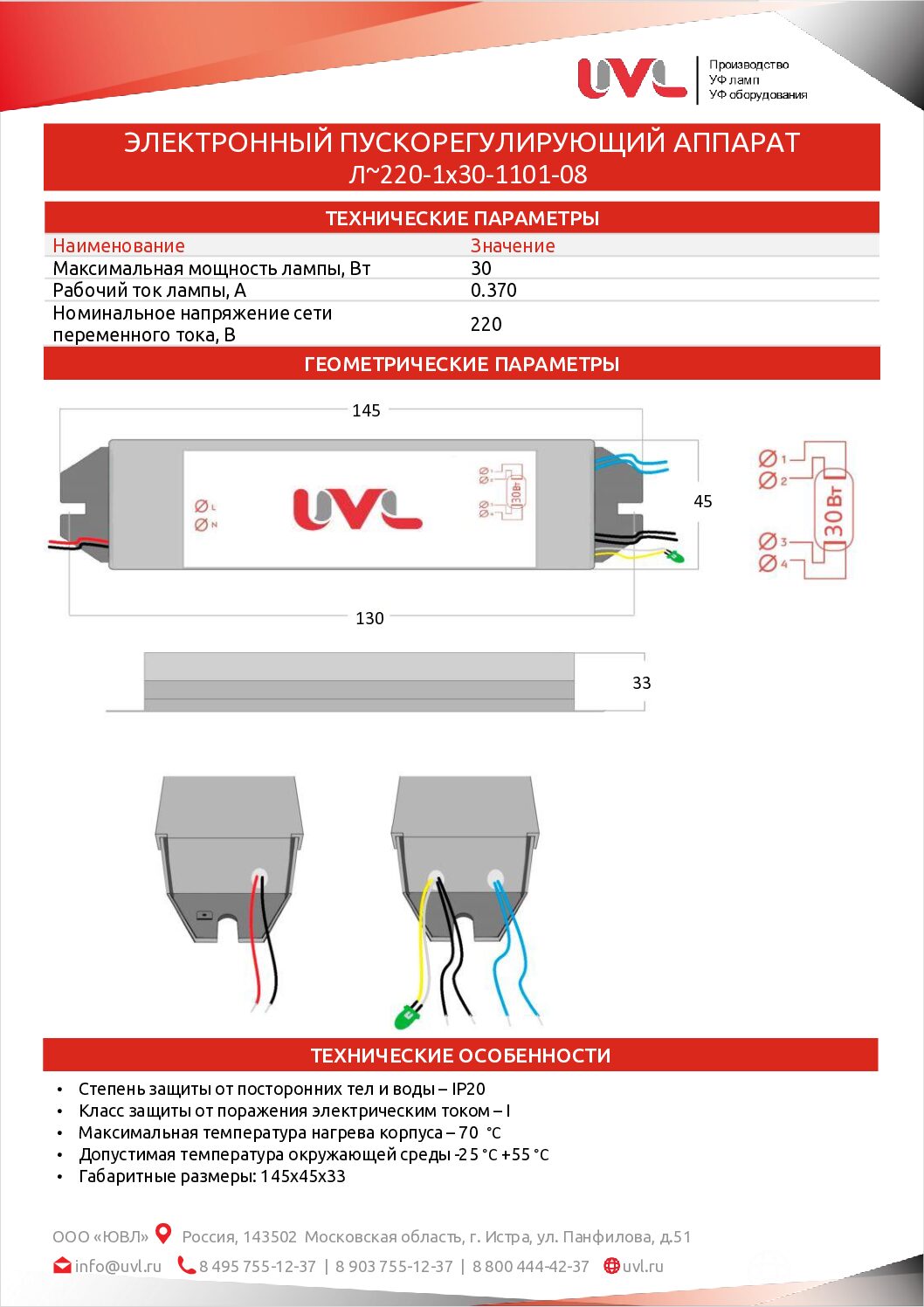 Электронный пускорегулирующий аппарат ЭПРА Л-220-1х30-1101-08 предназначен для питания УФ ламп с силой рабочего тока 0,37 А , максимальной мощностью 30 Вт и многих других моделей с соответствующими параметрами.