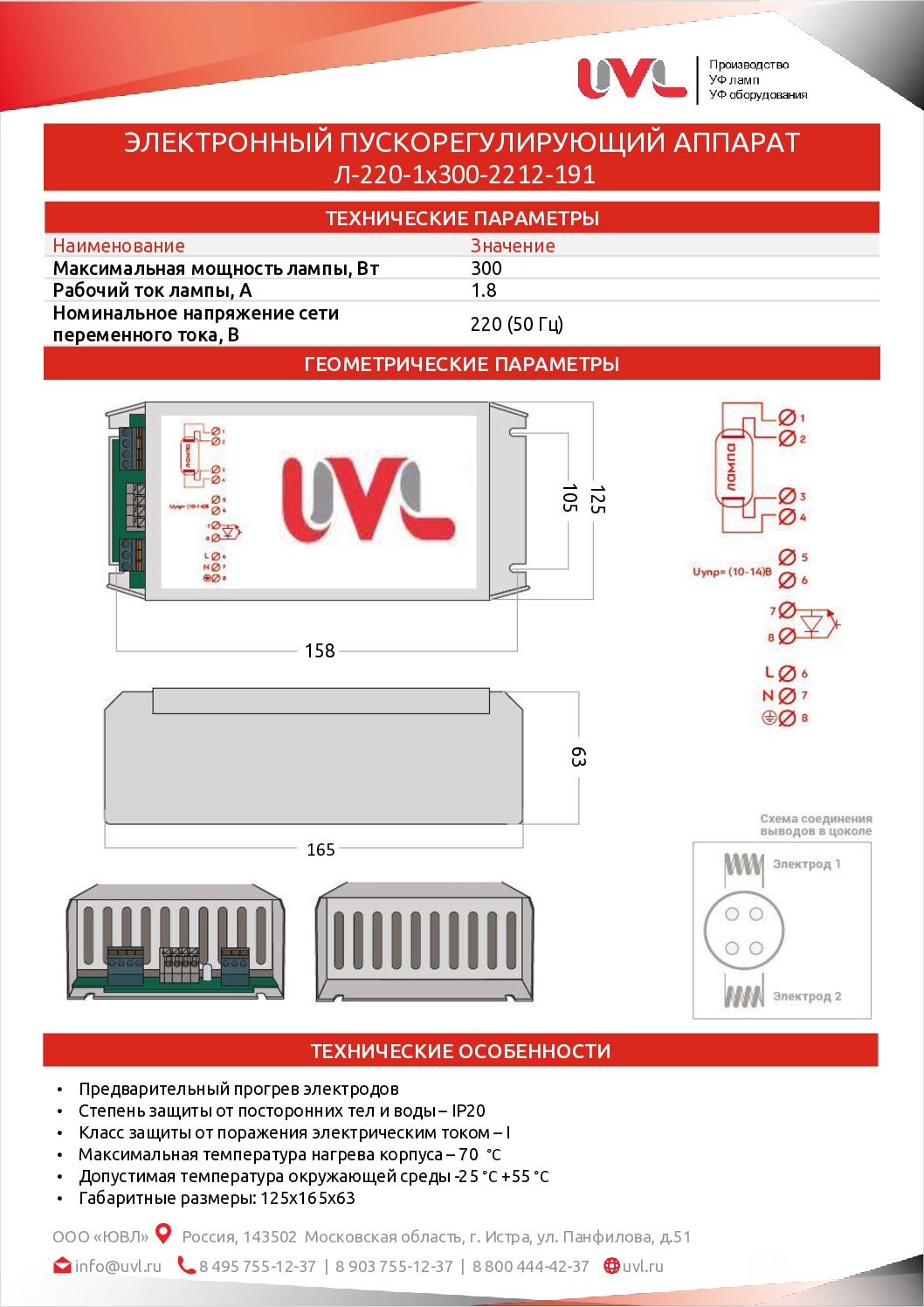 Электронный пускорегулирующий аппарат ЭПРА Л-220-1х300-2212-191 предназначен для питания УФ ламп с силой рабочего тока 1,8 А , максимальной мощностью 300 Вт и многих других моделей с соответствующими параметрами.