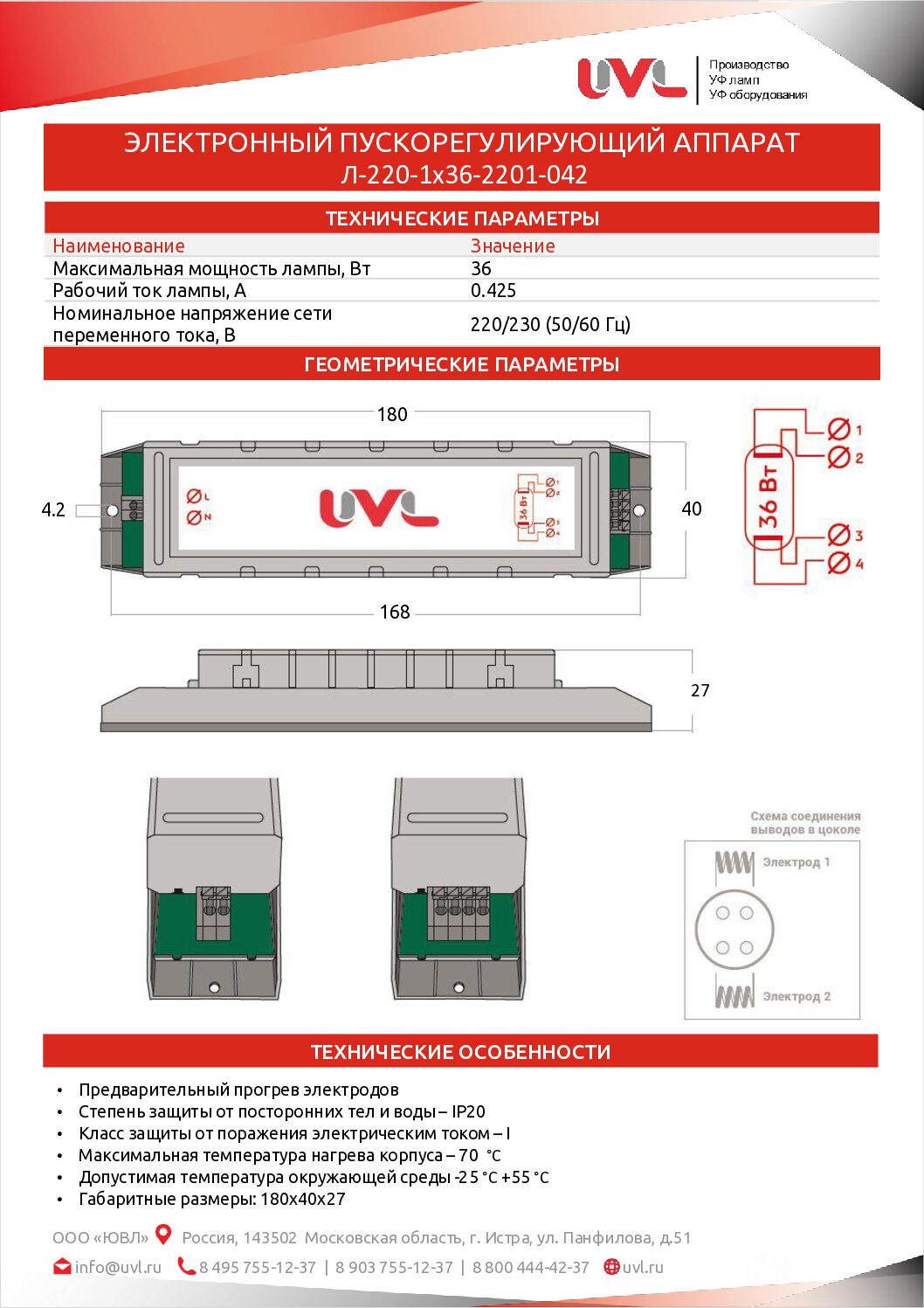 Электронный пускорегулирующий аппарат ЭПРА Л-220-1х36-2201-042 предназначен для питания УФ ламп с силой рабочего тока 0,425 А , максимальной мощностью 36 Вт и многих других моделей с соответствующими параметрами.