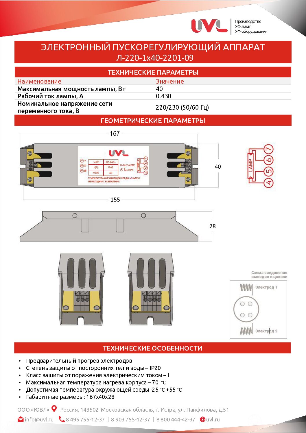 Электронный пускорегулирующий аппарат ЭПРА Л-220-1х40-2201-09 предназначен для питания УФ ламп с силой рабочего тока 0.430 А , максимальной мощностью 40 Вт и многих других моделей с соответствующими параметрами.