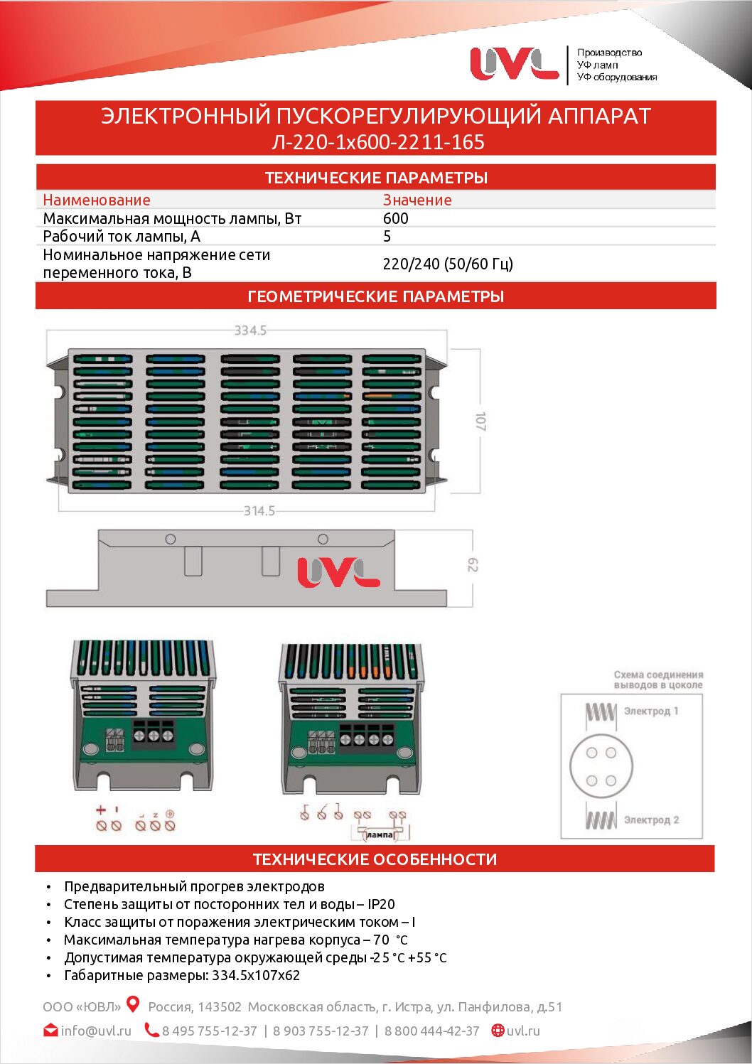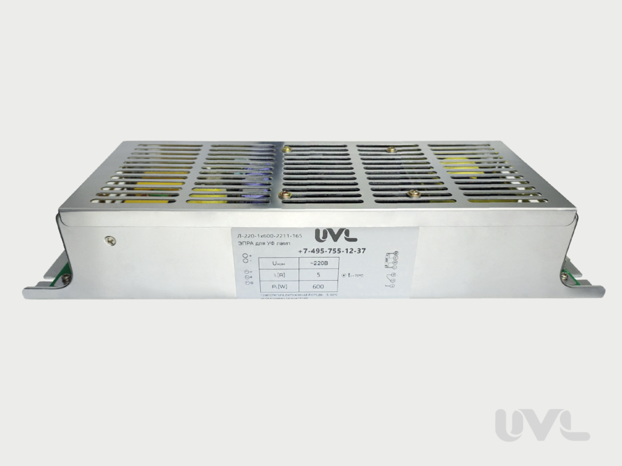 Электронный пускорегулирующий аппарат ЭПРА Л-220-1х600-2211-165 предназначен для питания УФ ламп с силой рабочего тока 5 А , максимальной мощностью 600 Вт и многих других моделей с соответствующими параметрами.