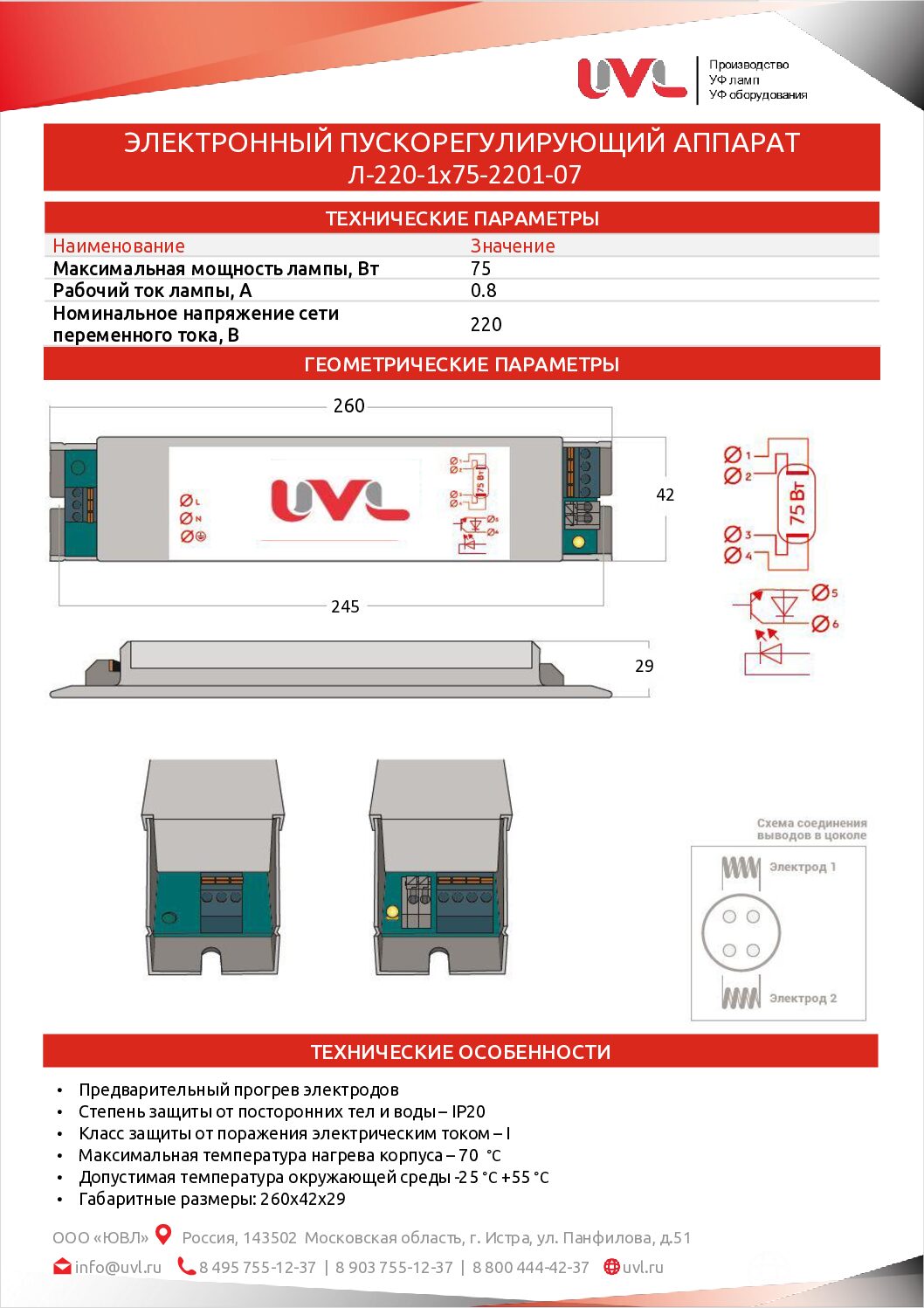 Электронный пускорегулирующий аппарат ЭПРА Л-220-1х75-2201-07 предназначен для питания УФ ламп с силой рабочего тока 0.8 А , максимальной мощностью 75 Вт и многих других моделей с соответствующими параметрами.