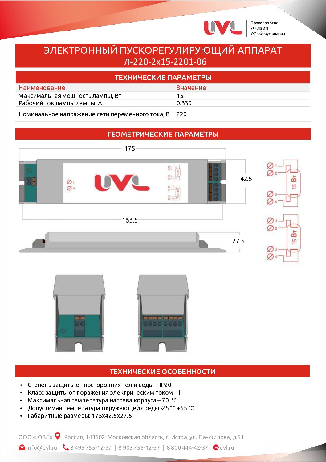 Электронный пускорегулирующий аппарат ЭПРА Л-220-2х15-2201-06 предназначен для питания УФ ламп с силой рабочего тока 0,33 А , максимальной мощностью 15 Вт и многих других моделей с соответствующими параметрами.
