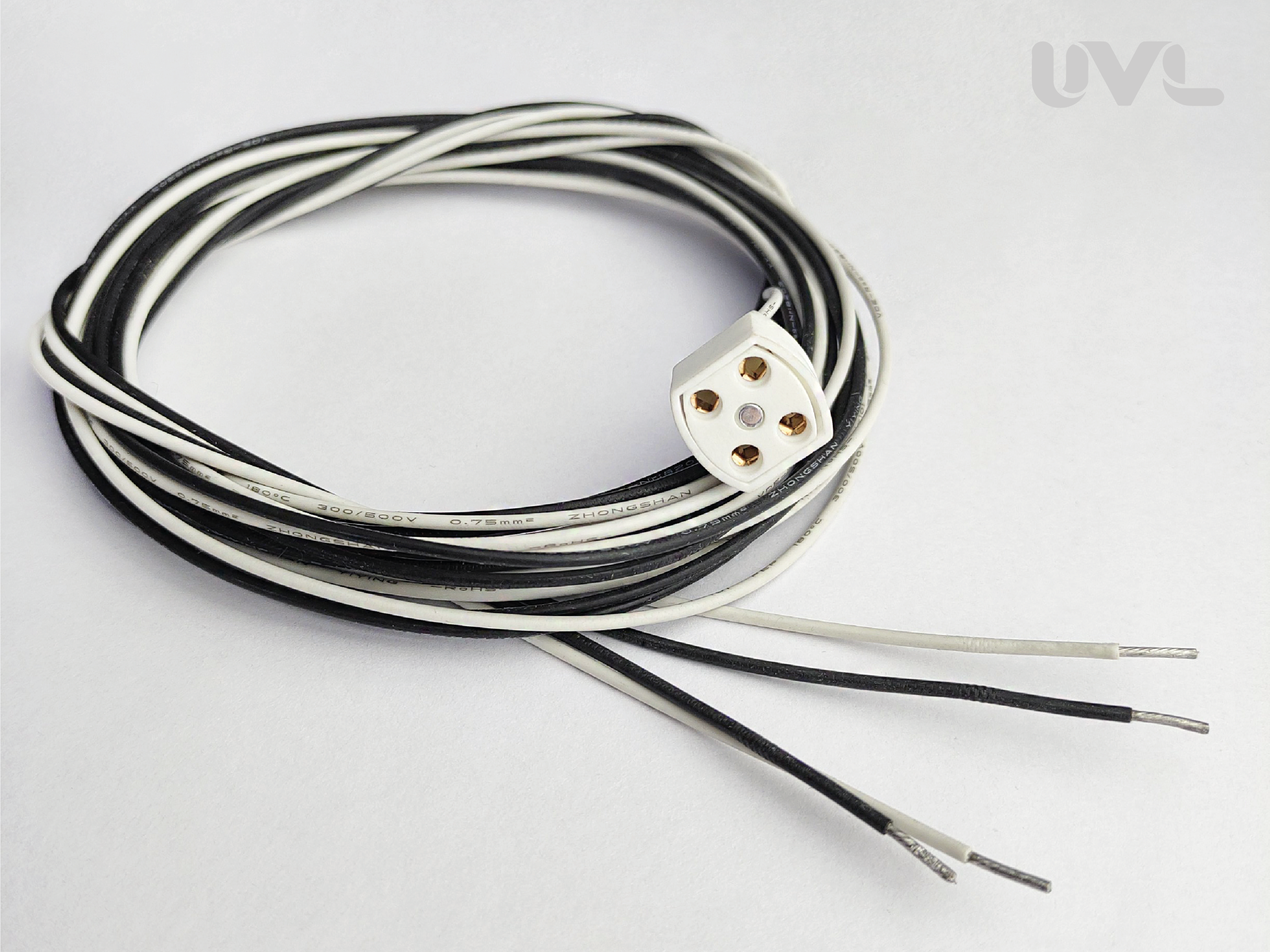 Керамический коннектор с проводами 200 см предназначен для подключения ультрафиолетовых ламп с цоколем 4Р к источнику питания. Они выполнены из материала, устойчивого к длительному воздействию мощного УФ излучения.
