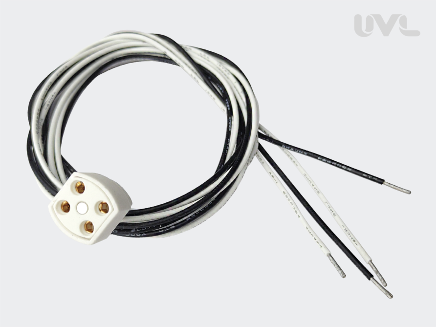 Керамический коннектор с проводами 95 см предназначен для подключения ультрафиолетовых ламп с цоколем 4P к источнику питания. Они выполнены из материала, устойчивого к длительному воздействию мощного УФ излучения.