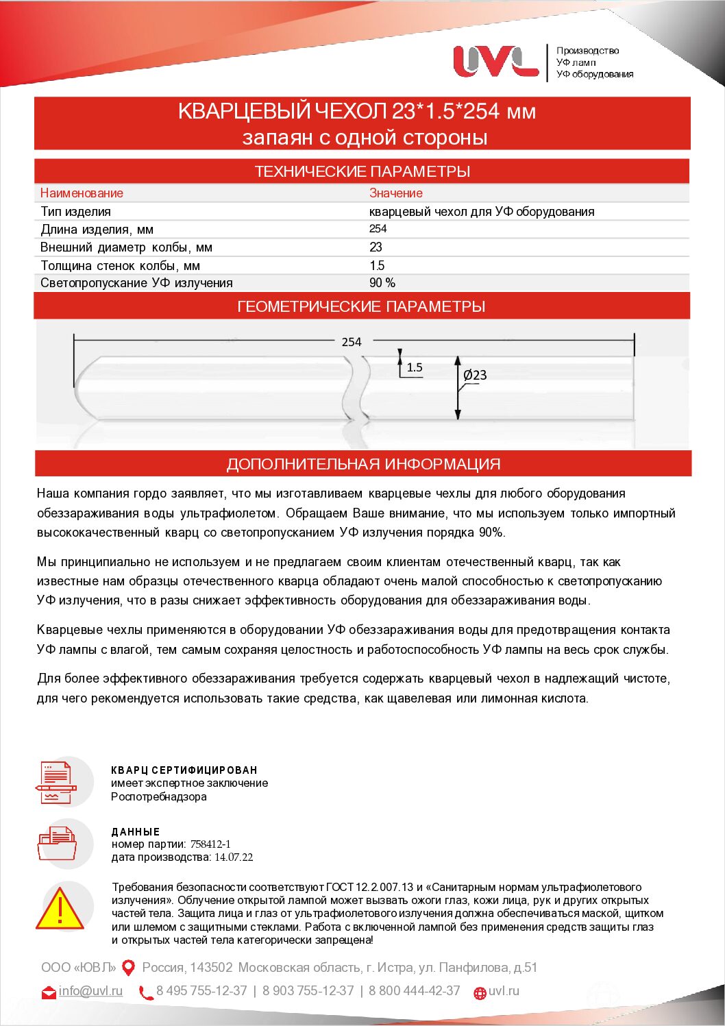 Кварцевый чехол нашего производства предназначен для работы в установках по обеззараживанию воды - VIQUA VT1, SQ-PA, UV1, (S212RL).