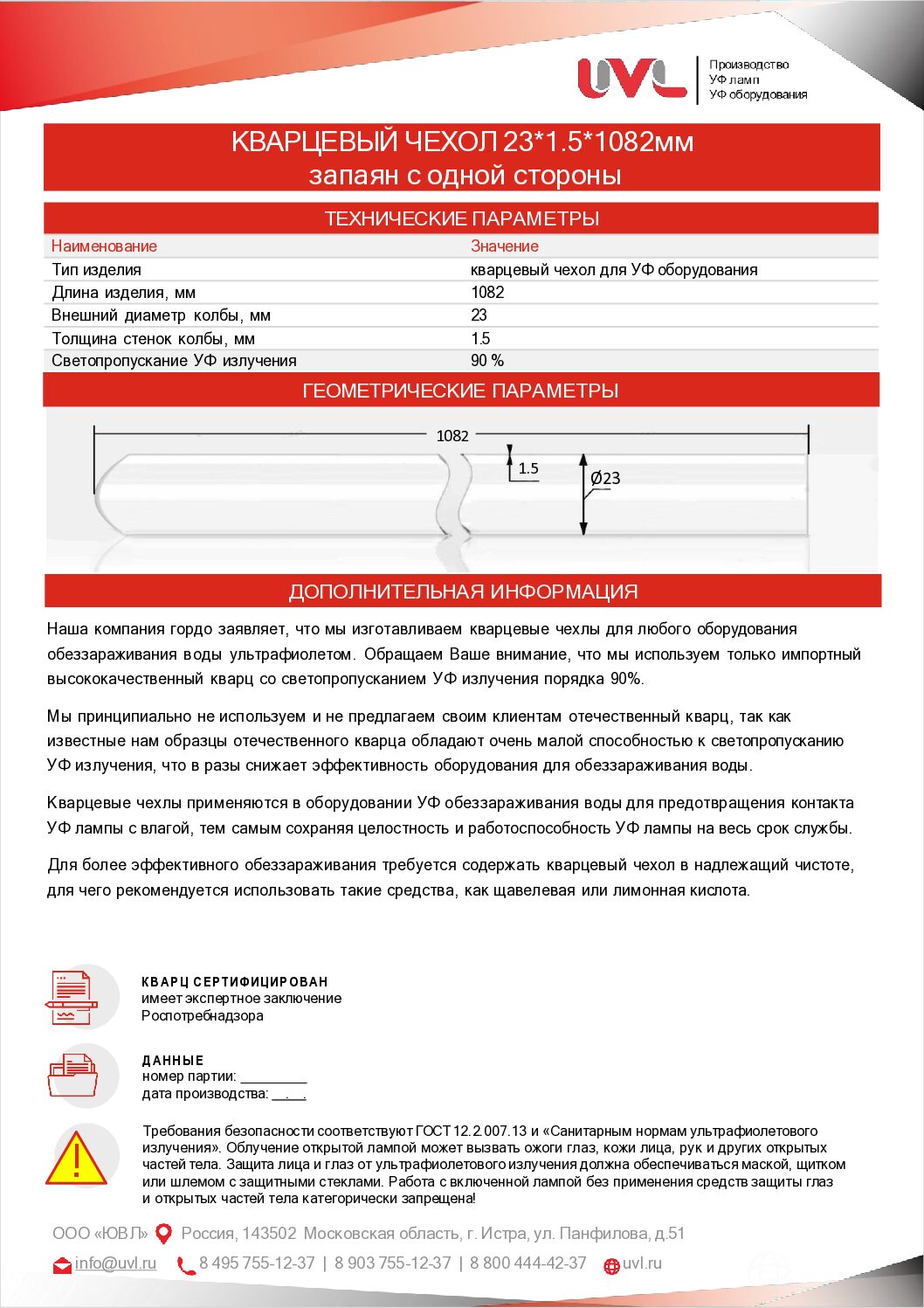 Кварцевый чехол QS-950 для VIQUA SP950 (S950RL-HO) 1082х1.5х23 мм