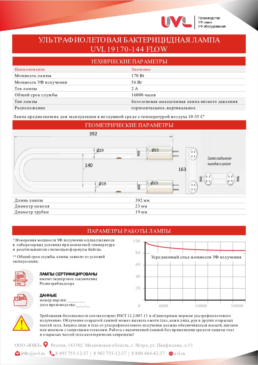 Бактерицидная УФ лампа UVL 19170-144 FLOW нашего производства предназначен для работы в установках по обеззараживанию воздуха.