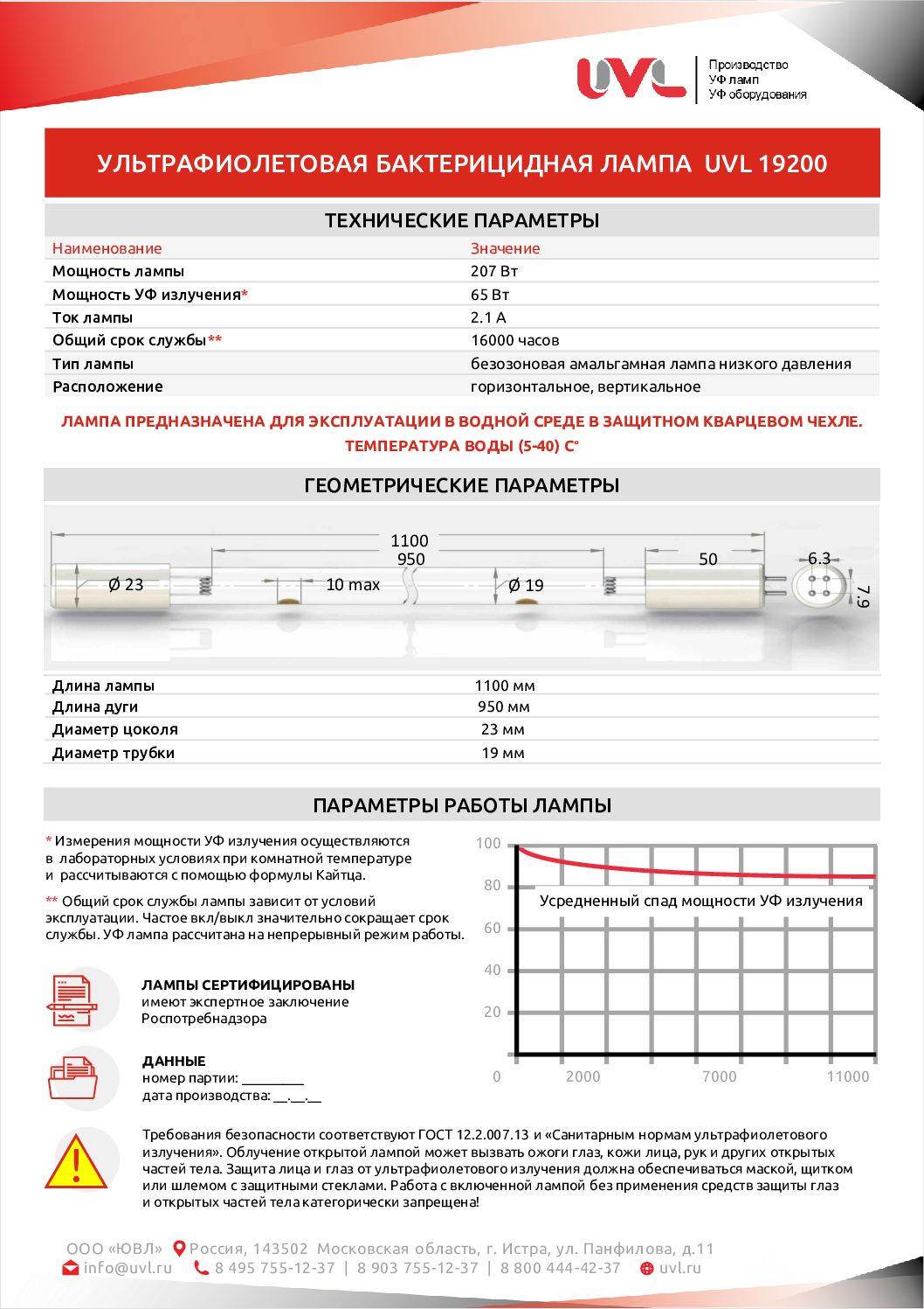 Бактерицидная УФ лампа UVL 19200 мощностью 207 Вт нашего производства предназначен для работы в установках по обеззараживанию.