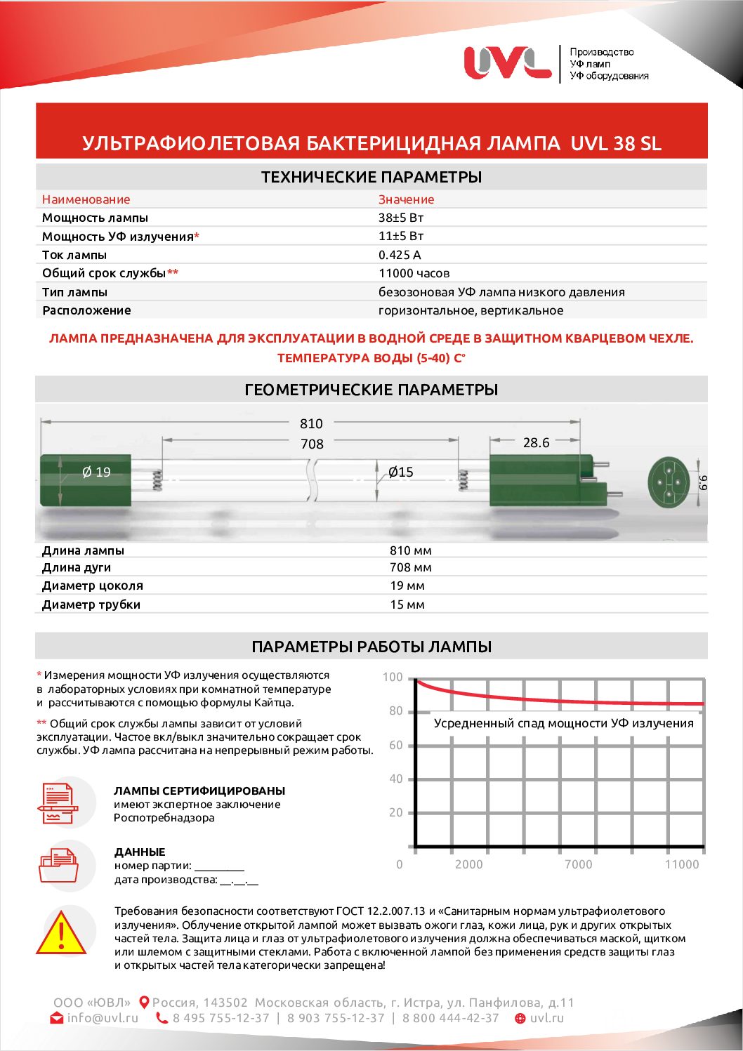 * На внутреннюю поверхность лампы нанесен состав UVL-LivePower+. Данная технология позволяет избежать быстрого падения мощности УФ излучения, чем существенно продлевает эффективный срок службы лампы.
