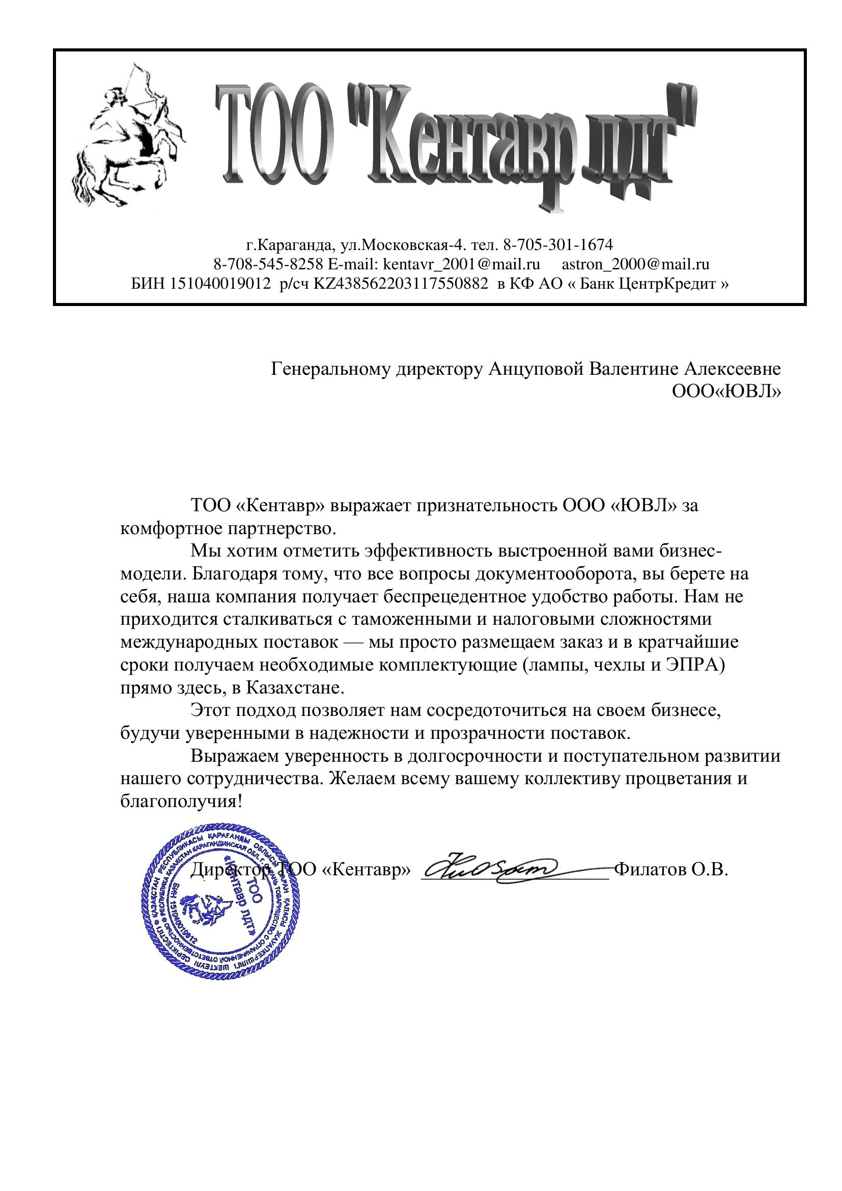 Письмо благ. ТОО Кентавр лдт 10.10
