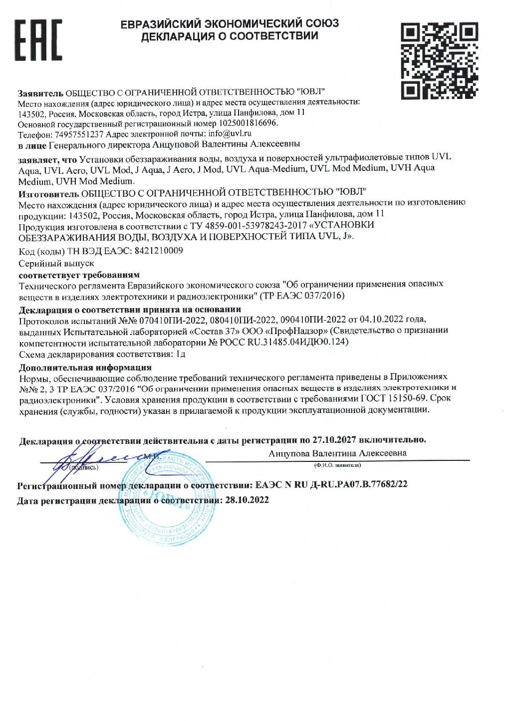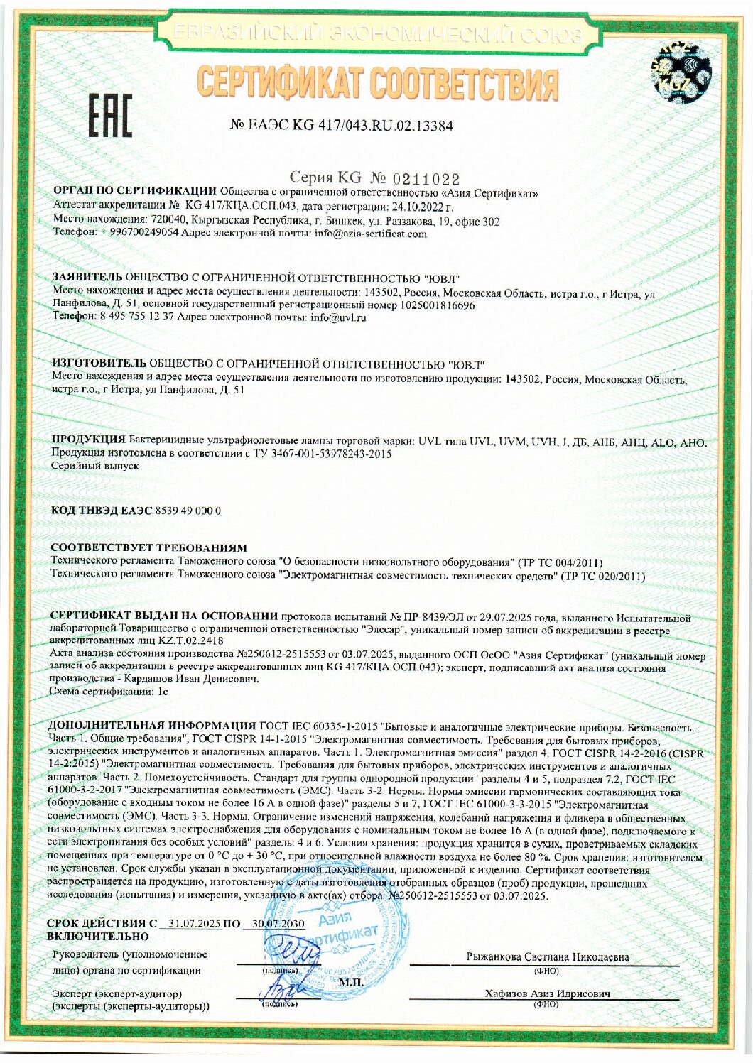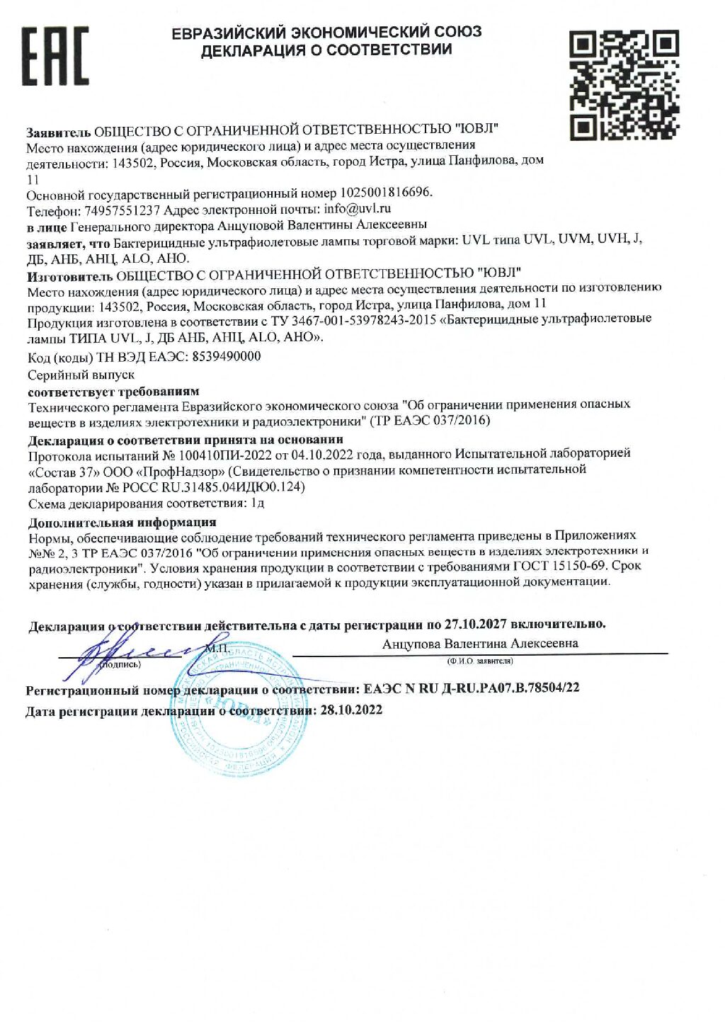Сертификат на УФ лампы ДБ АНЦ АНБ АНО АLО J