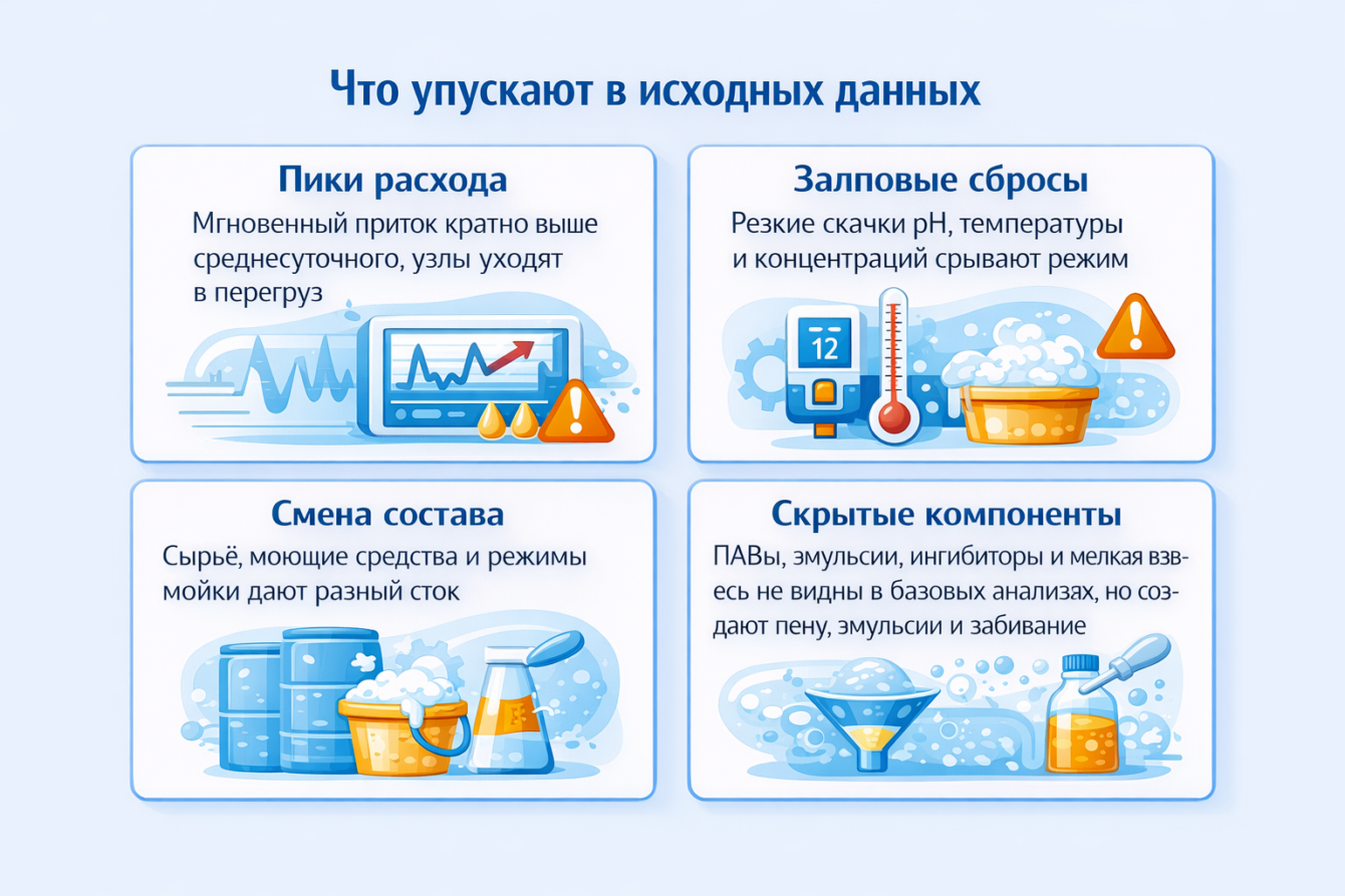 Надёжная система сбора и очистки сточных вод начинается с понимания входной воды как процесса во времени: что и когда попадает в поток, где возникают кратковременные скачки и какие компоненты создают самые тяжёлые режимы.