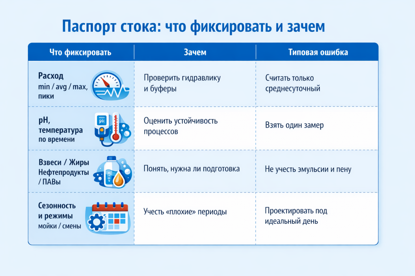 Минимальный паспорт стока, который стоит собрать до проектирования:
